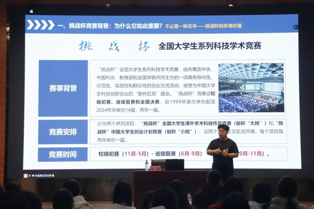 王磊立足赛事评分体系与赛道规则,深度解析了赛道精准选择、科研项目打磨优化、参赛材料规范制作等关键内容,帮助同学们规避备赛误区、明晰参赛规划。还围绕竞赛价值挖掘、项目创新突破、商业计划书撰写、PPT优化等实用技能展开细致分享,以专业视角为同学们的科研竞赛之路指明方向,有效激发了大家的参赛热情与科研动力。