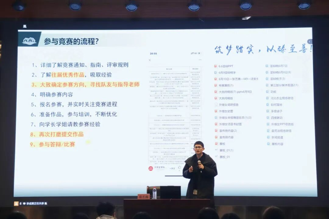 张艺腾以竞赛筹备全流程为核心脉络,聚焦信息搜集、团队组建、项目构建、答辩技巧等核心环节,系统拆解了从选题立项到参赛冲刺的全链条关键要点。结合自身在“挑战杯”等高端赛事中的深耕经历,重点讲解了答辩现场的节奏掌控、逻辑构建、临场应答等核心技巧,同时针对科研选题方向、跨专业团队搭建等内容,给出了兼具实操性与指导性的建议,为同学们理清了科研竞赛的基础思路。