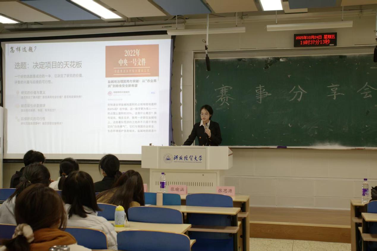 随后,科创空间站部长张瑜涵就调研类赛事进行了深入解读。她围绕科学选题、问卷设计、实地调研等环节,结合“调研河北”“冀青调研”等省级重点赛事案例,生动展示了调研类比赛的魅力与挑战。她认为,调研不仅是数据的收集,更是对社会问题的洞察与回应。参与这类赛事,不仅能提升调研能力,更能培养同学们发现问题、分析问题、解决问题的综合素养。