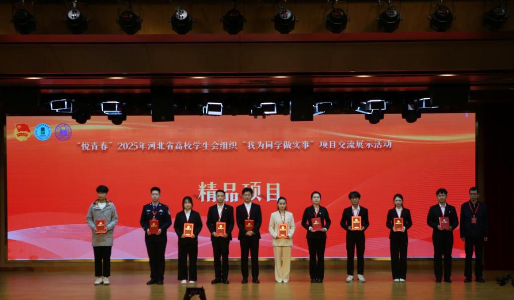 2025年10月28日,“悦青春”2025年河北省高校学生会组织“我为同学做实事”项目交流展示活动在河北工业大学圆满落幕。该活动由共青团河北省委、河北省学生联合会共同主办,河北工业大学承办。经学校推荐、全省遴选,我校学生会“凝心聚力,青春筑基”思想引领工程从众多高校项目中脱颖而出,成功入围最终展示环节,并荣获“精品项目”称号。