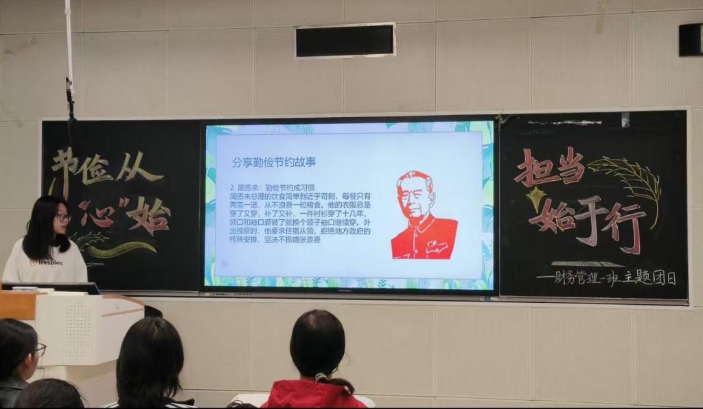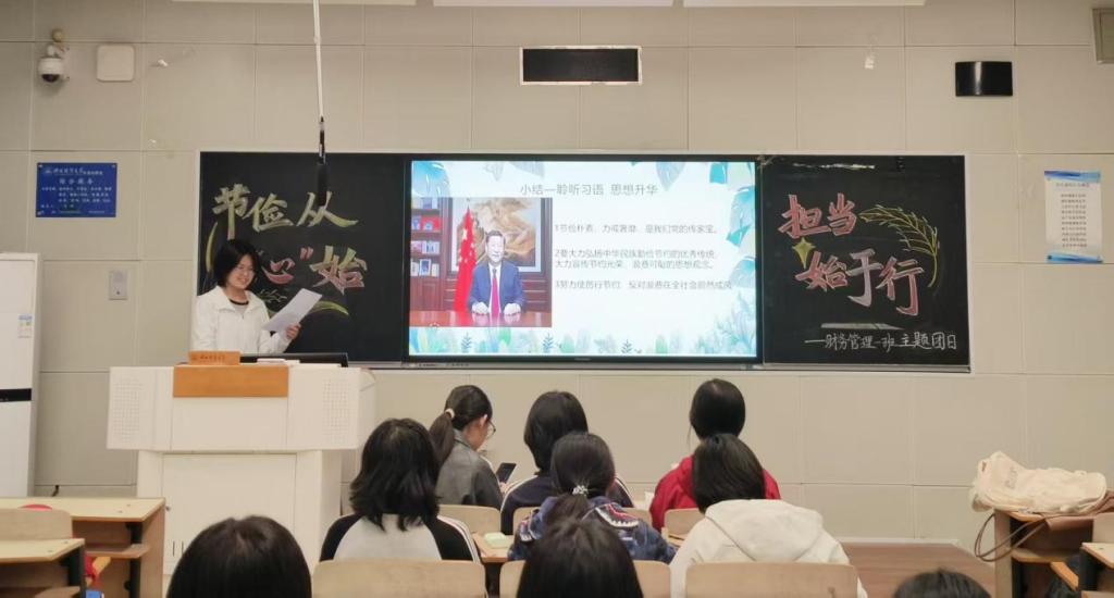 10月17日晚7时, 2025财务管理1班全体同学在北三教A114教室举办“节俭从‘心’始,担当践于行”主题团日活动。此次活动由本班团支部组织,支部书记王雪静主持。