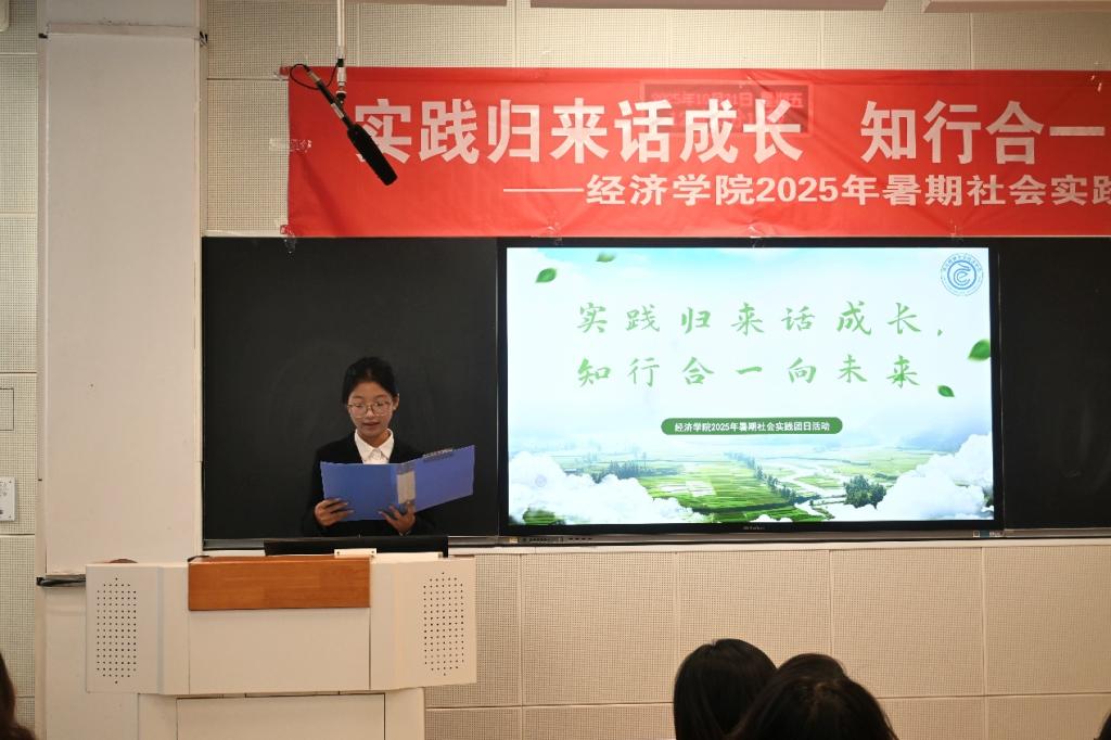 活动伊始,经济学院团委书记吴子雨为大会致辞。吴子雨简要总结了本次暑期社会实践的总体情况,指出在院党委领导下,学院成功组织千余名学生,通过集中实践、分散实践、重点小分队、专业小分队及“云支教”等多种形式,深入社会开展实践,并取得了荣获校级“社会实践先进单位”等丰硕成果。她鼓励在场学生骨干积极发挥带头作用,动员更多同学在实践中锻炼成长,服务社会。